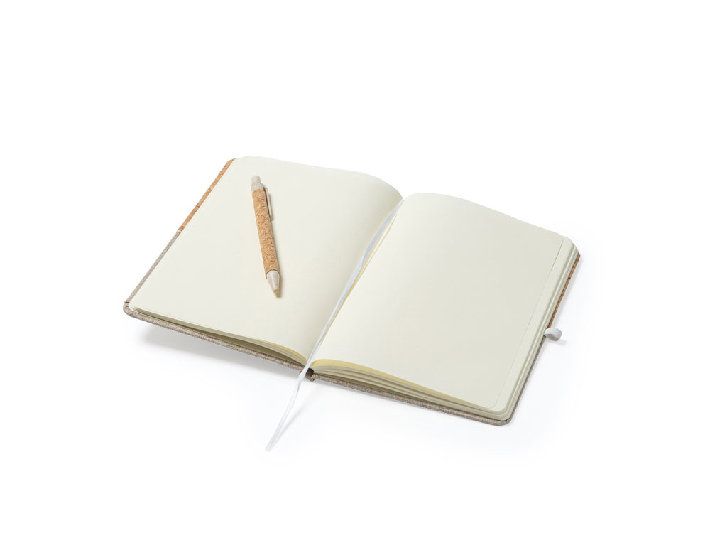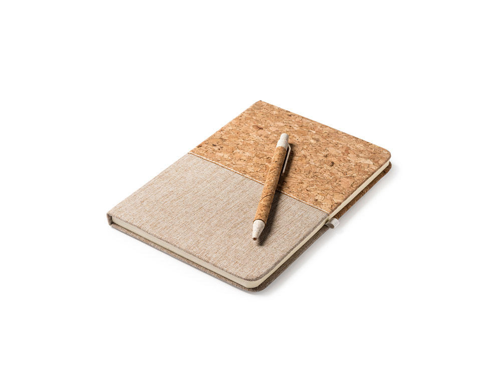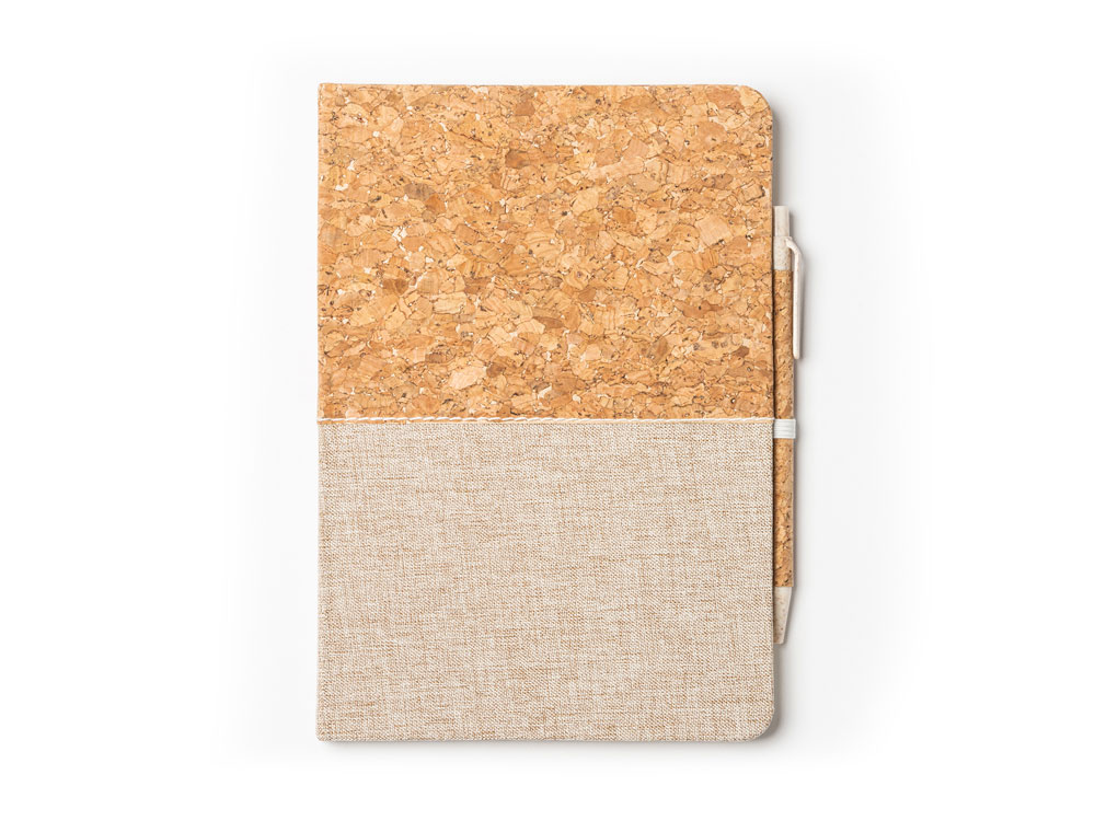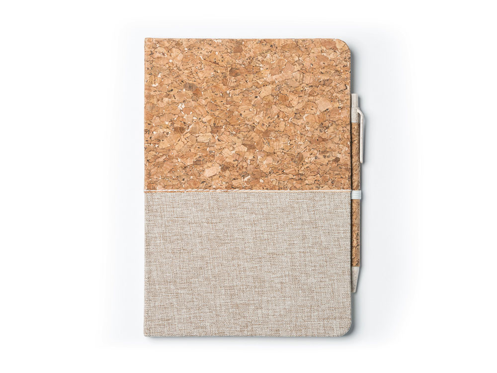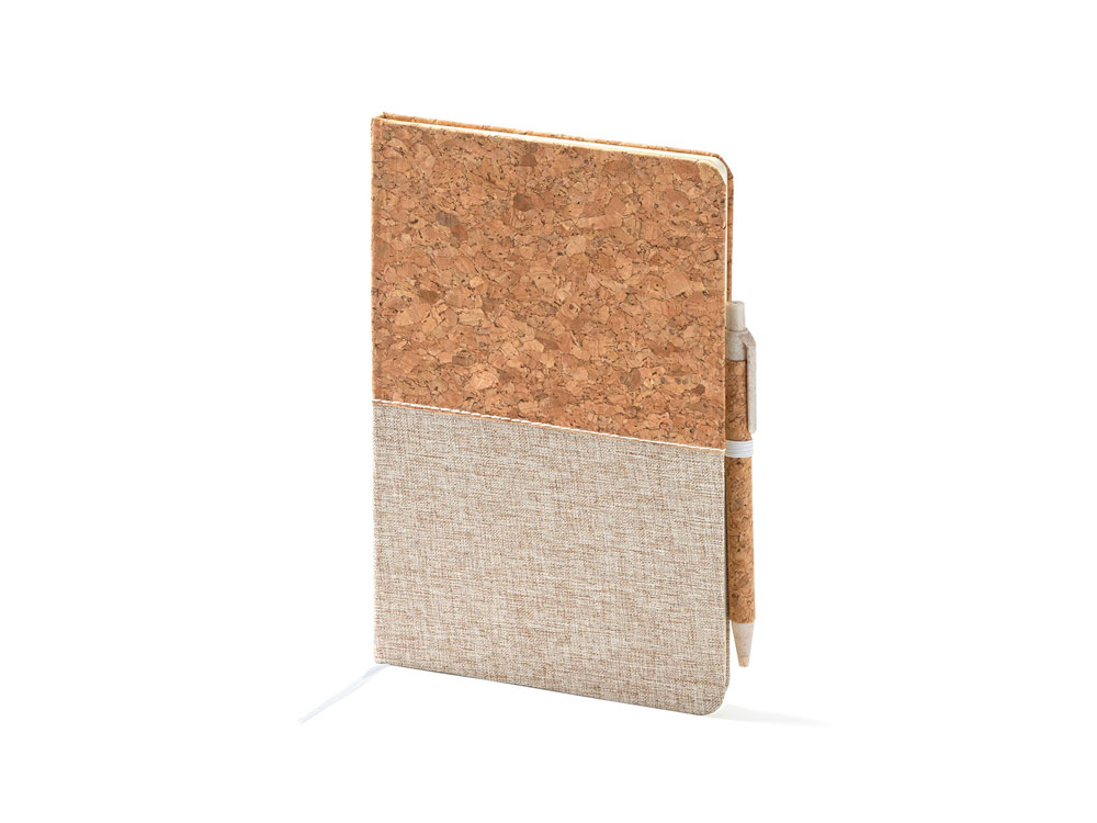 Блокнот формата А5 в твердой обложке из пробки и хлопка. 80 простых листов. Ручка из пробки и пшеничного волокна в комплекте.