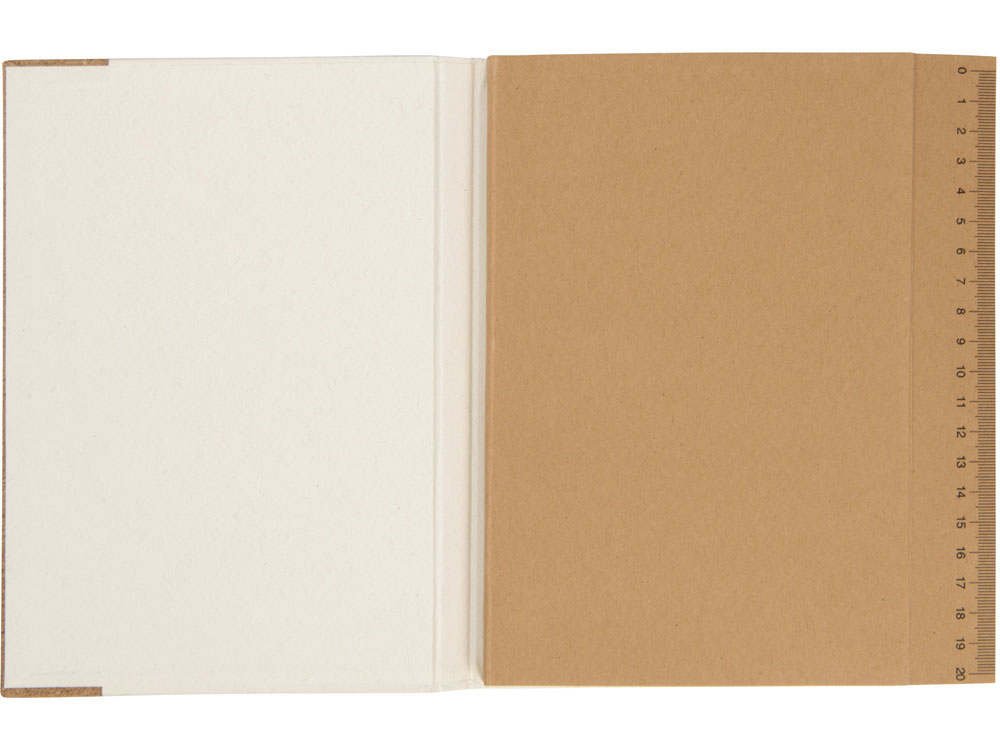 Блокнот сделан из микса экологичных материалов: пробки, крафта и бумаги из переработанных пакетиков из-под молока. У блокнота двойная обложка: основная из картона из-под молочных пакетиков и пробки, вторая обложка из крафта с линейкой, которая может пригодиться в любой момент. В блокноте 80 листов А5 в линейку, последние 16 страниц имеют разную линовку (клетка, точки, пустые страницы).