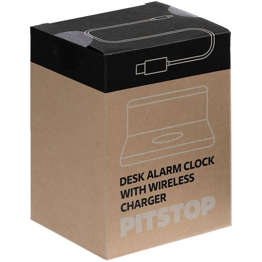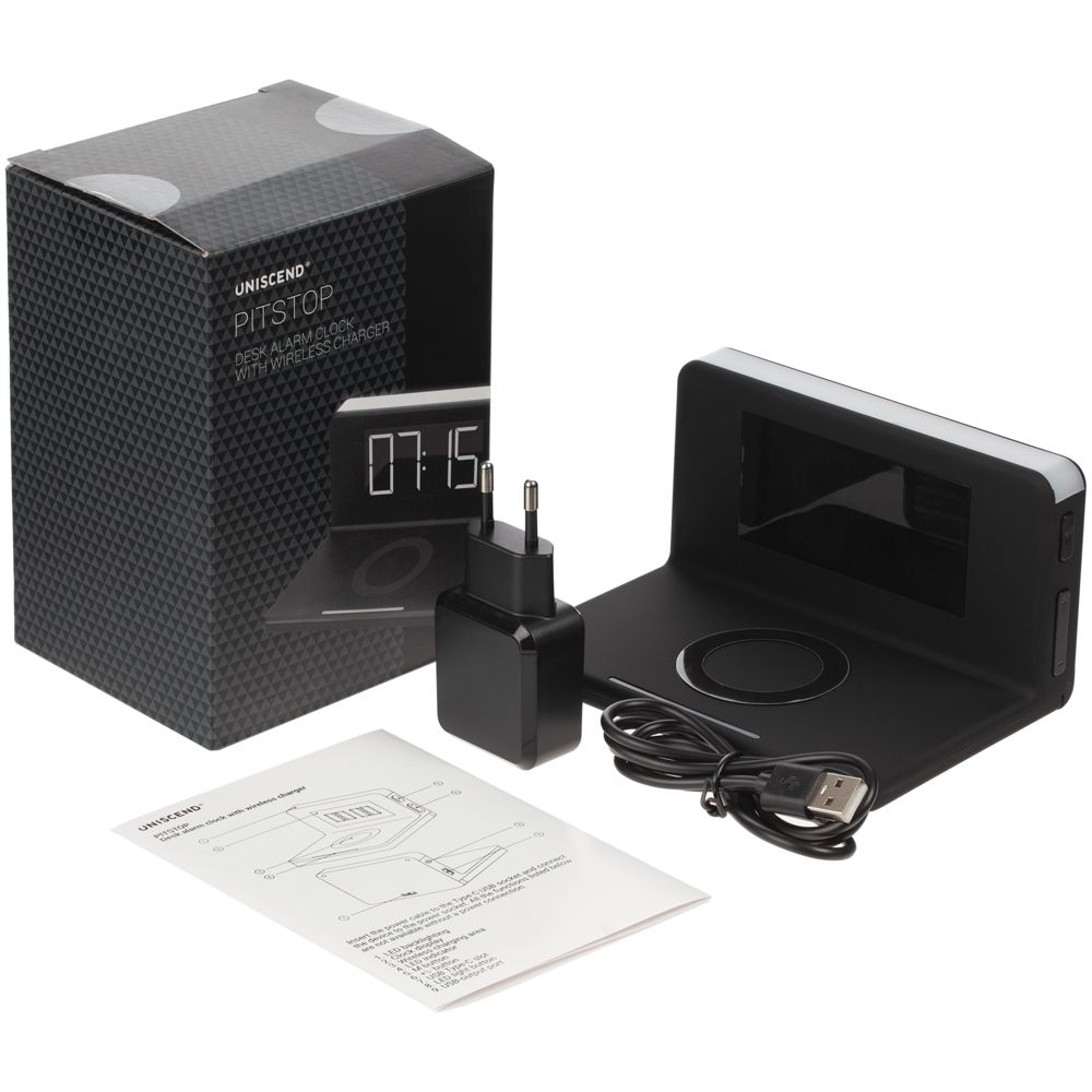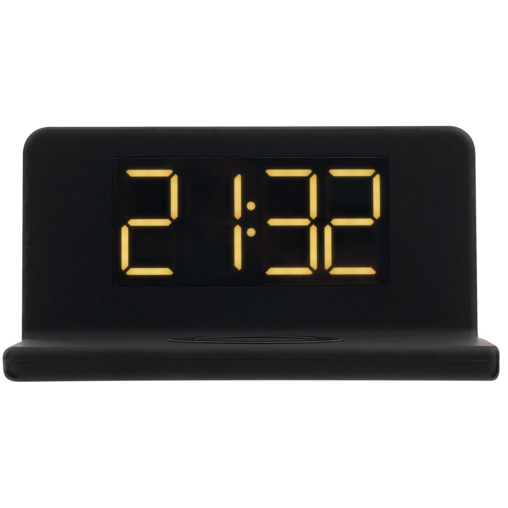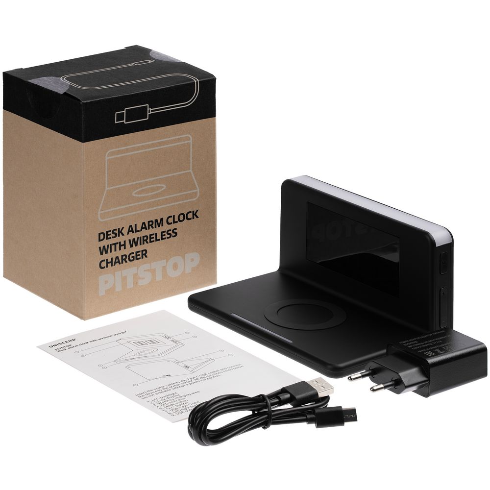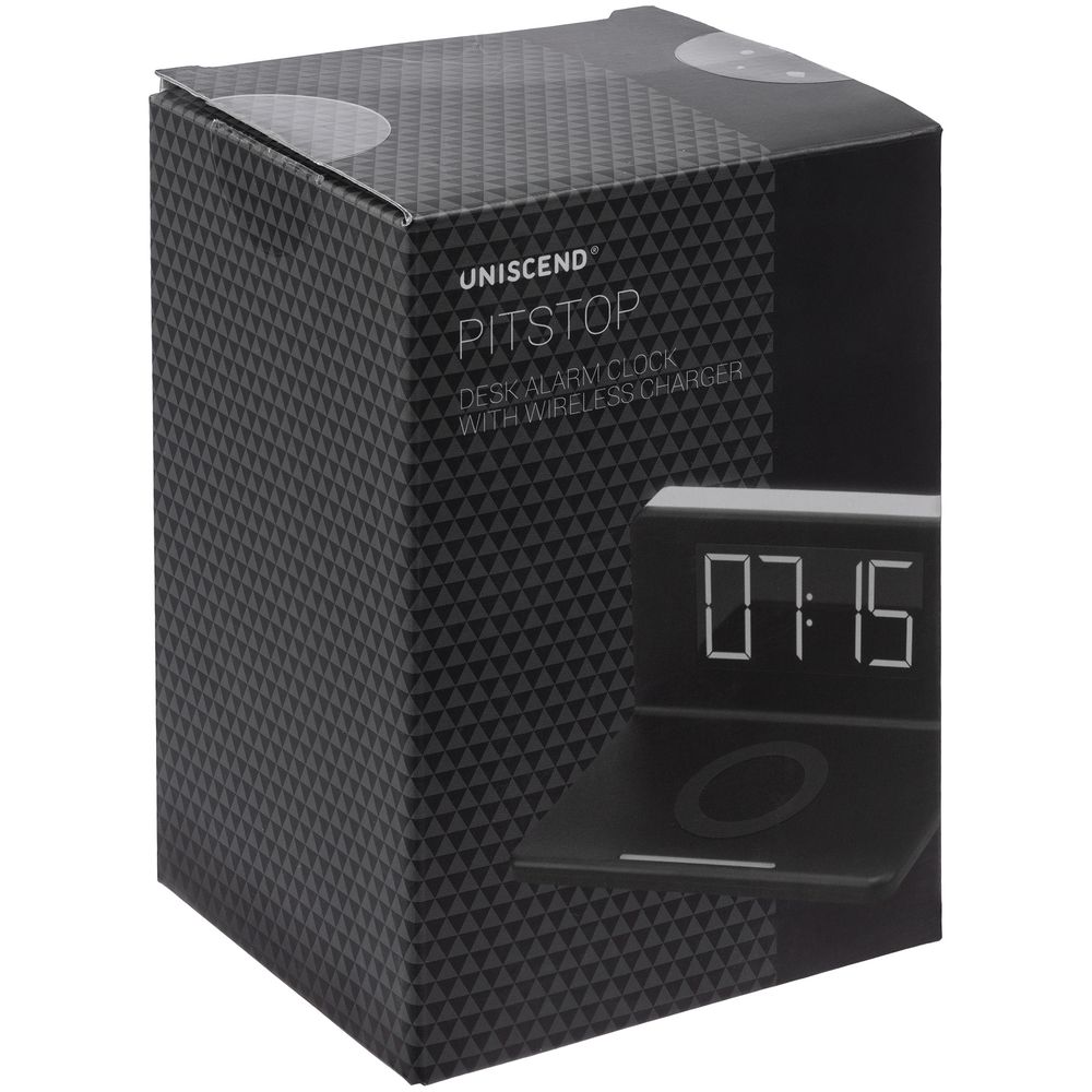 Часы настольные с беспроводным зарядным устройством Pitstop, черные купить оптом и в розницу с нанесением логотипа в Перми