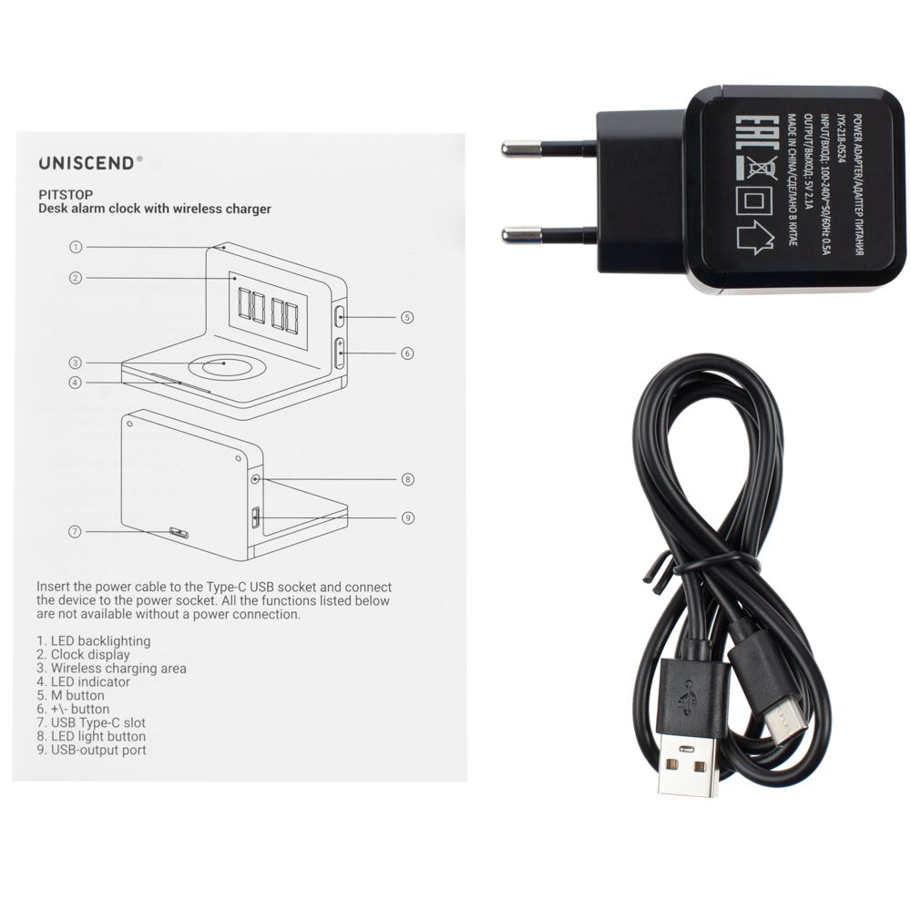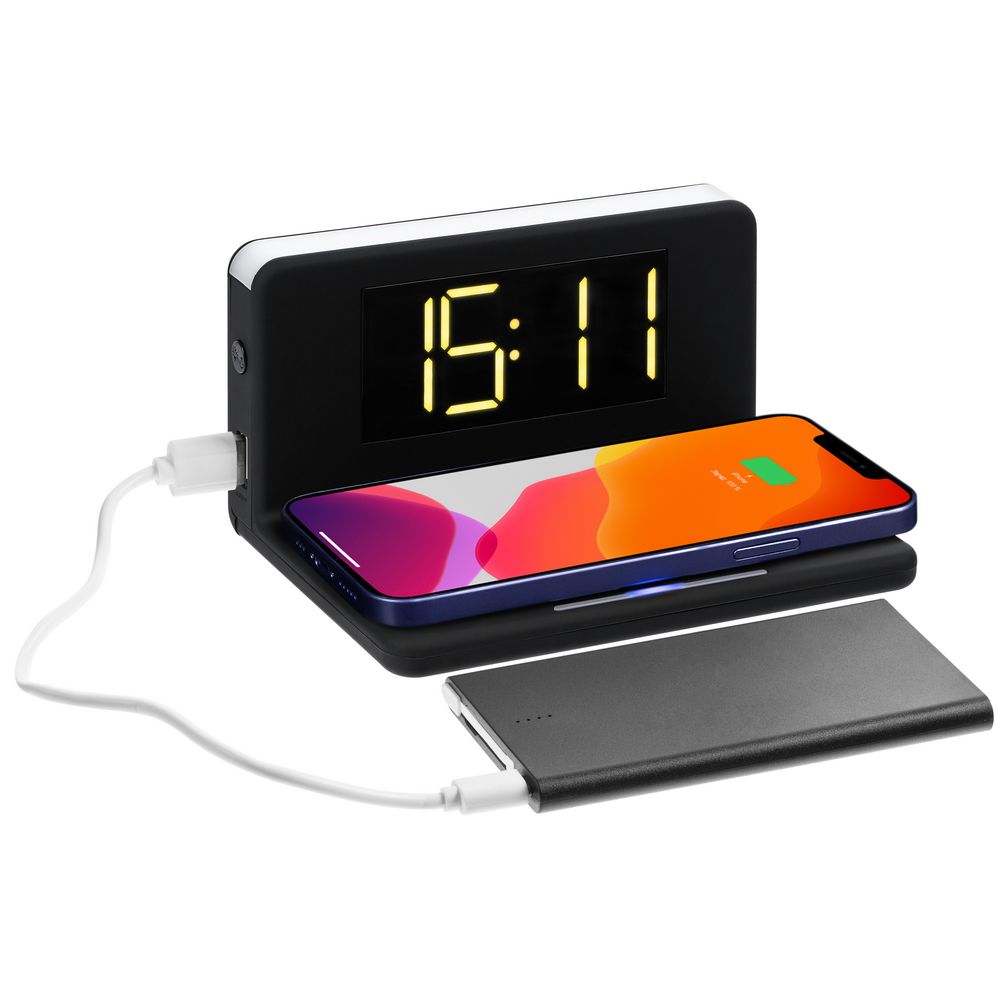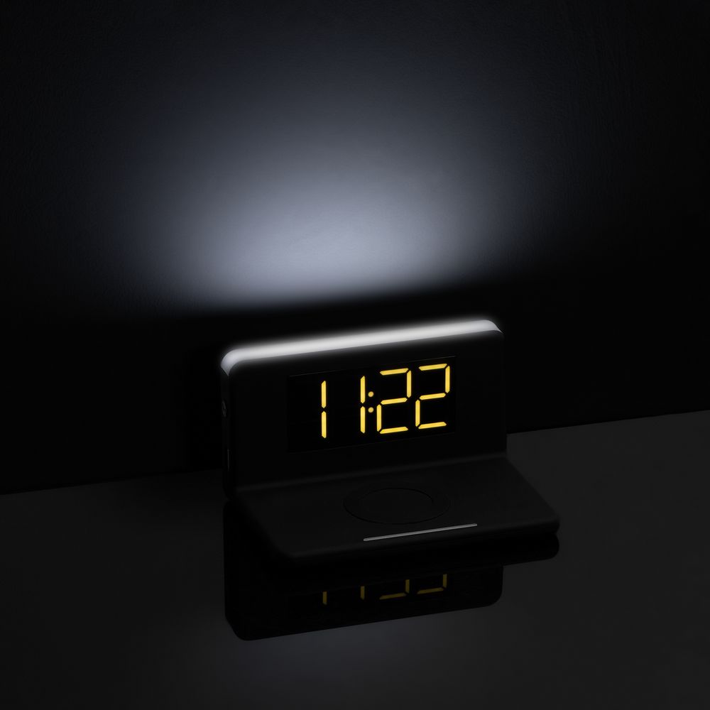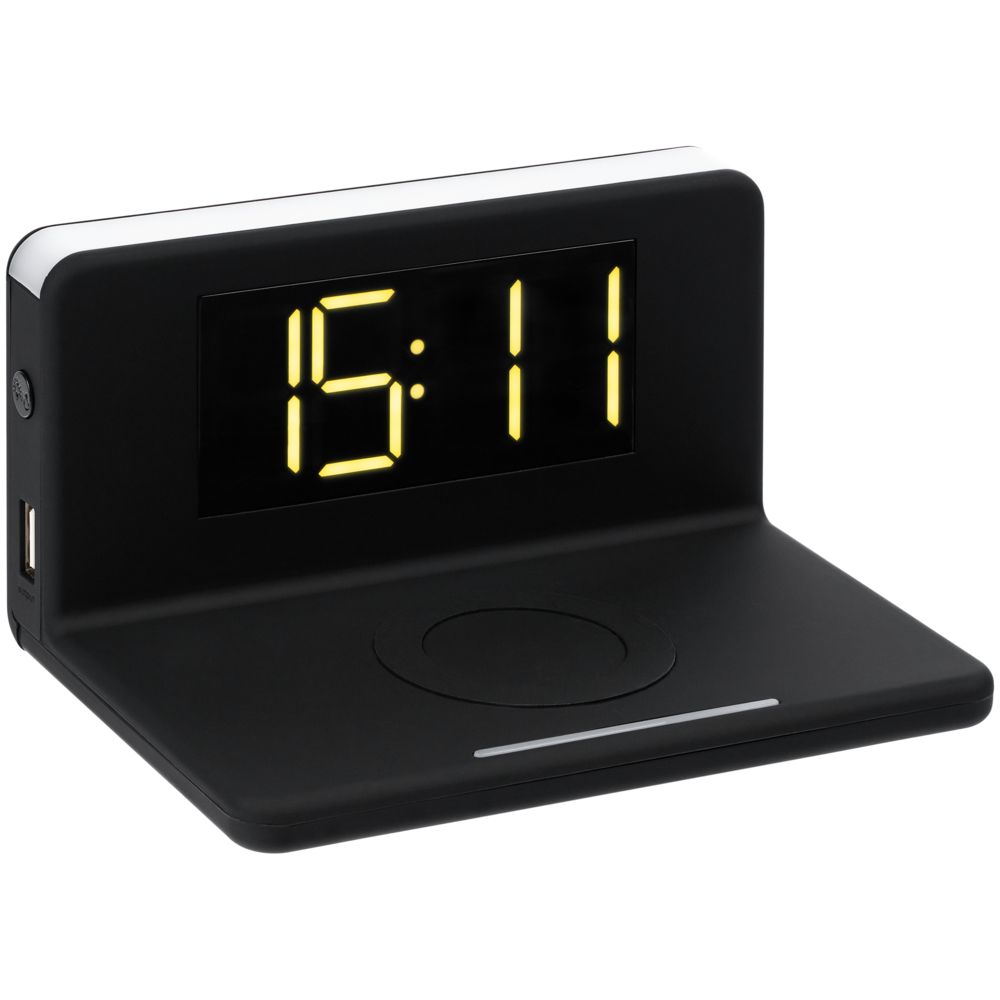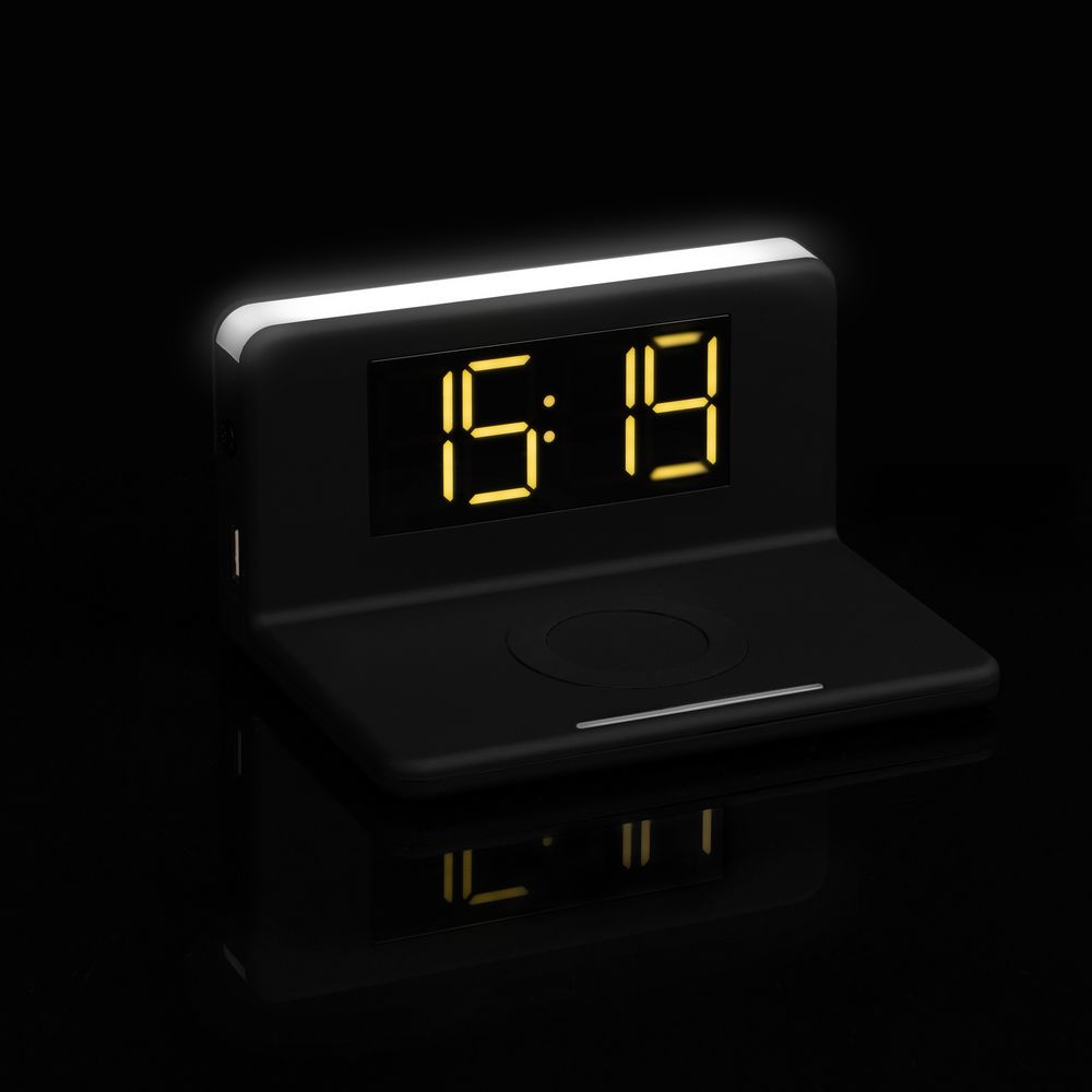 Часы настольные с беспроводным зарядным устройством Pitstop, черные купить оптом и в розницу с нанесением логотипа в Перми