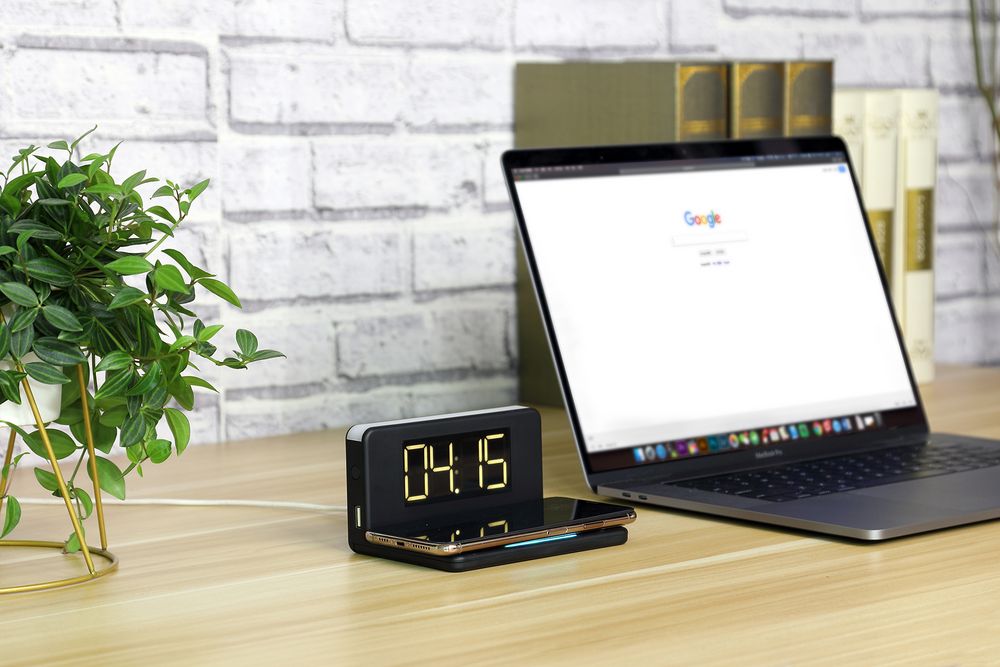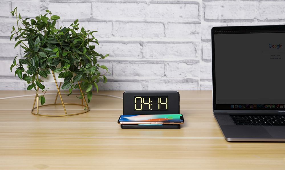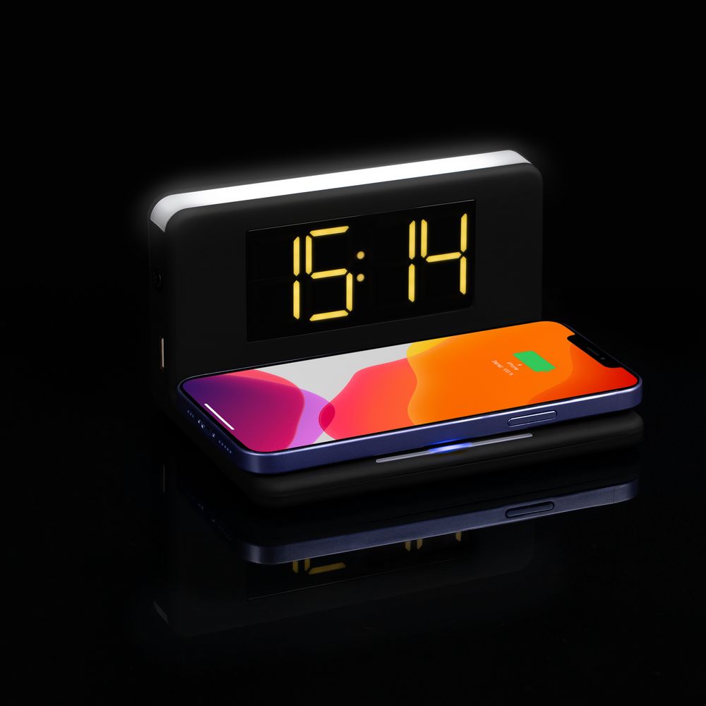 Часы настольные с беспроводным зарядным устройством Pitstop, черные