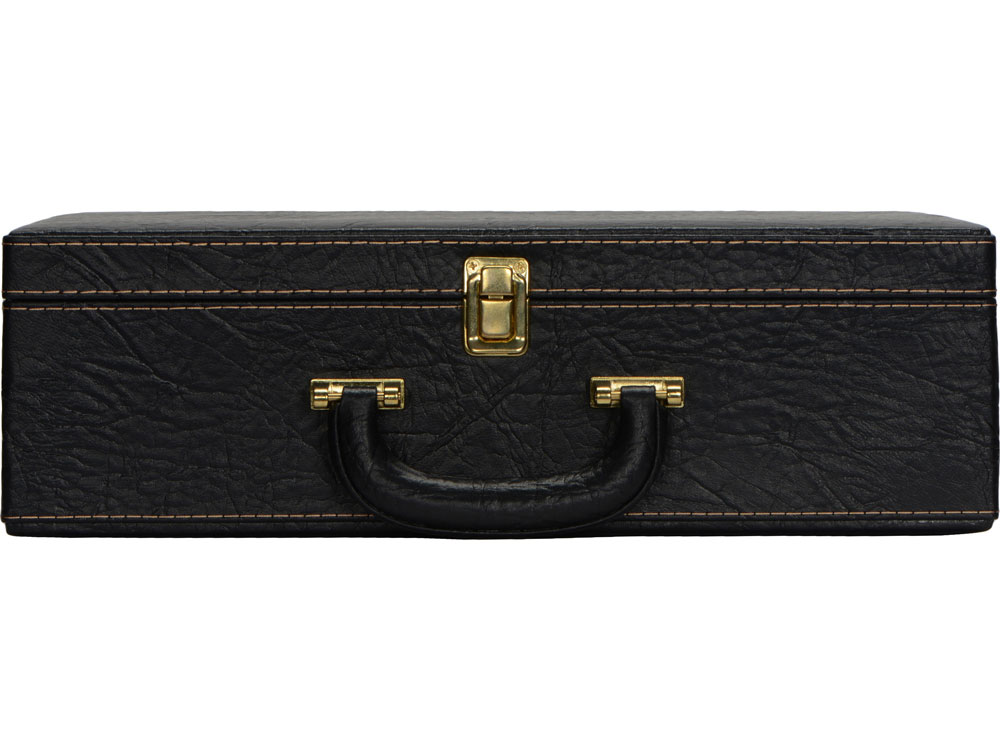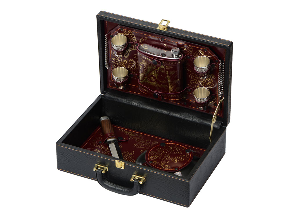 Кейс из сплит-кожи, с повышенной износостойкостью, внутренняя отделка натуральная кожа. В комплекте: Фляга 240 мл (нерж.сталь)– 1шт. Стопка 40 мл (нейзильбер)– 4 шт. Зажигалка зиппо– 1 шт. Нож Универсал (нерж. сталь) 45Х13, рукоять орех, бронзовое литье– 1 шт. Тарелка из нейзильбера– 4 шт.