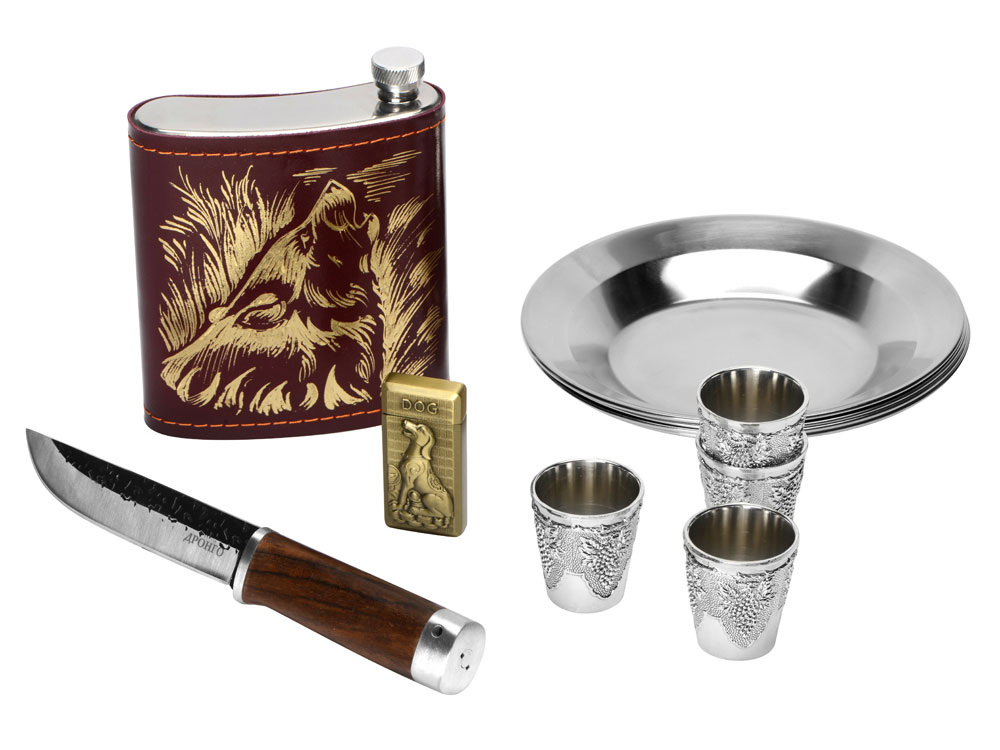 Комплектность тарелка d18,3 х 2,5 см - 4шт, нож 23,5 х 3 х 2,3 см, зажигалка 3,3 х 6,7 х 1,2 см, стопка d4,3 х 4,9 см - 4шт, фляга 12,7 х 16 х 4 см