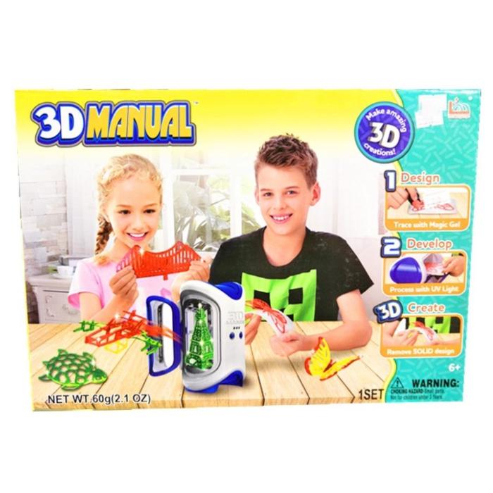 Освоить новые технологии и получить приятных эмоций от создания своими руками чего-то нового можно с набором для творчества 3D MANUAL. Здесь вы найдете все необходимое для создания объемных моделей – 3D маркер и гель, которым его заправлять, формочки и трафареты для стандартных форм. Подробная инструкция, которая идет в комплекте, поможет вам сделать первые шаги в области моделирования.